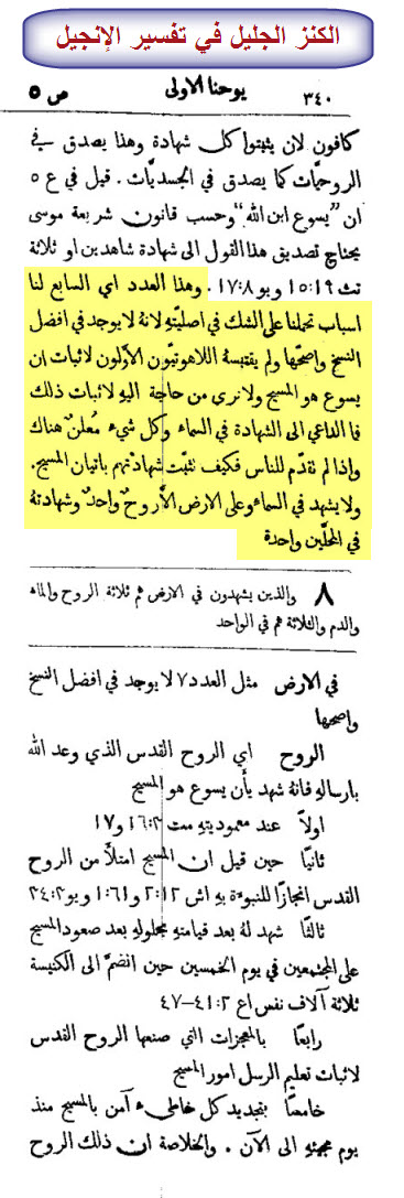 7 فَإِنَّ هُنَالِكَ ثَلاَثَةَ شُهُودٍ فِي السَّمَاءِ، الآبُ وَالْكَلِمَةُ وَالرُّوحُ الْقُدُسُ، وَهَؤُلاءِ الثَّلاَثَةُ هُمْ وَاحِدٌ.