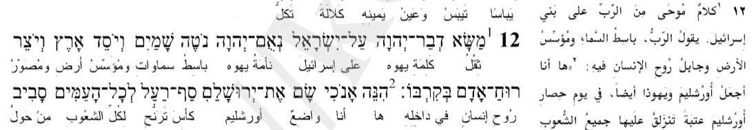 מַשָּׂא דְבַר-יְהוָה, עַל-יִשְׂרָאֵל: נְאֻם-יְהוָה, נֹטֶה שָׁמַיִם וְיֹסֵד אָרֶץ, וְיֹצֵר רוּחַ-אָדָם, בְּקִרְבּוֹ.