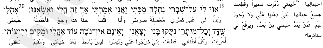 الذي قال هذا الكلام، يشكو حاله، فيقول:"خيمتي دمرت تدميرًا، وقطعت جميع حبالها، بني ذهبوا عني، ولا وجود لهم، فمن يمد خيمتي من بعد، ويرفع لي ستائرها".