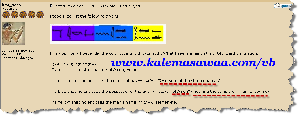 بالنسبة لما أوردته عن نطق الحرف الأول في كلمة "هامان" الذي هو على شكل حبل ملفوف تنطق "حاء" أو "هاء" ودللت على ذلك بالصورة الموجودة وأدلة أخرى لكن تعليقي على الصورة التي اقتبستُها هو أنه اتضح لي "وقد أكون أسأت الفهم " أن الحبل الملفوف ينطق حاء وذلك لأنهم مثلوا عليه بكلمة محمد أما الشكل الآخر ينطق هاء وقد مثلوا له بكلمة hot