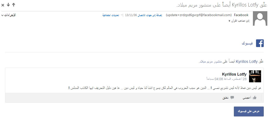 وهنا يؤكد قوله أنه المسيحية ليست دين ،، طبعاً أعطيته بعض أدلة التحريف ، ومن إفلاسهم أنهم لم يستطيعوا الرد على أي سؤال من سؤالي سوى بما ينسف اعتقادهم أو يثبت مدى جهلهم ، لم أحتفظ بالحوار عندي وهذه الصور أتيت بها من بريدي الإلكتروني حيث يصله أي تعليق أعلقه في الفيس بوك ....