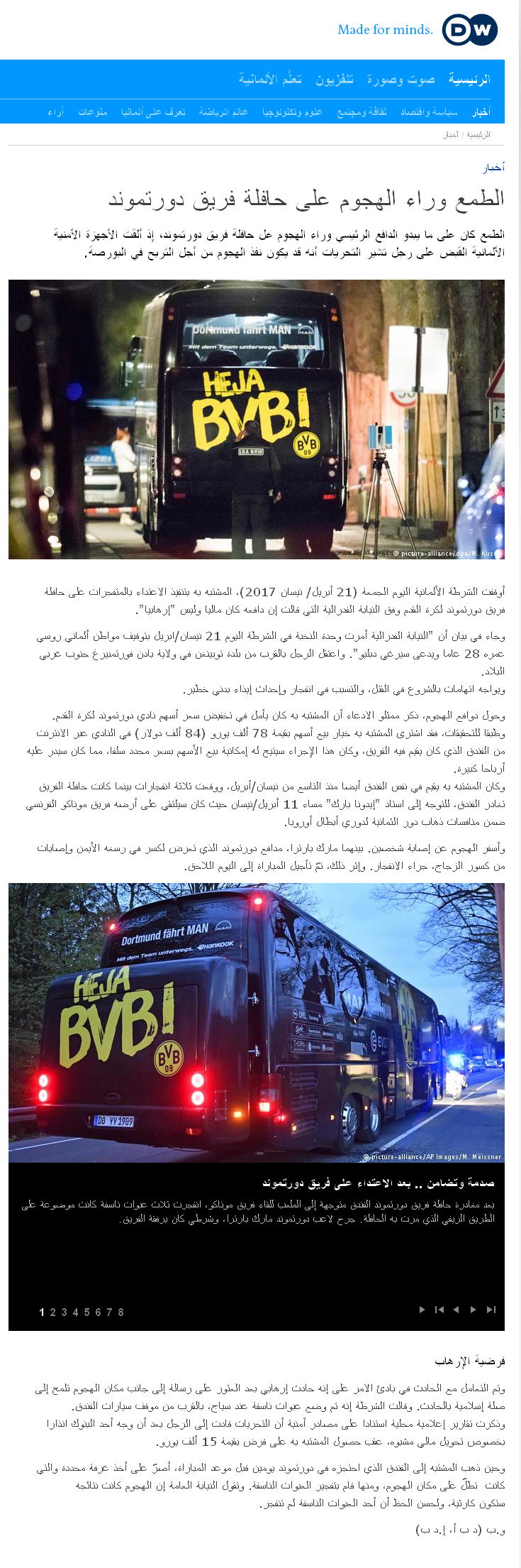 مباشرة بعد الهجوم على الحافلة التي كانت تقل فريق '' دورتموند'' أشارت أصابع الإتهام في بادئ الأمر- كالعادة طبعاً - إلى الإسلام العظيم وهو من هذه الهجمة الإرهابية و غيرها براء .