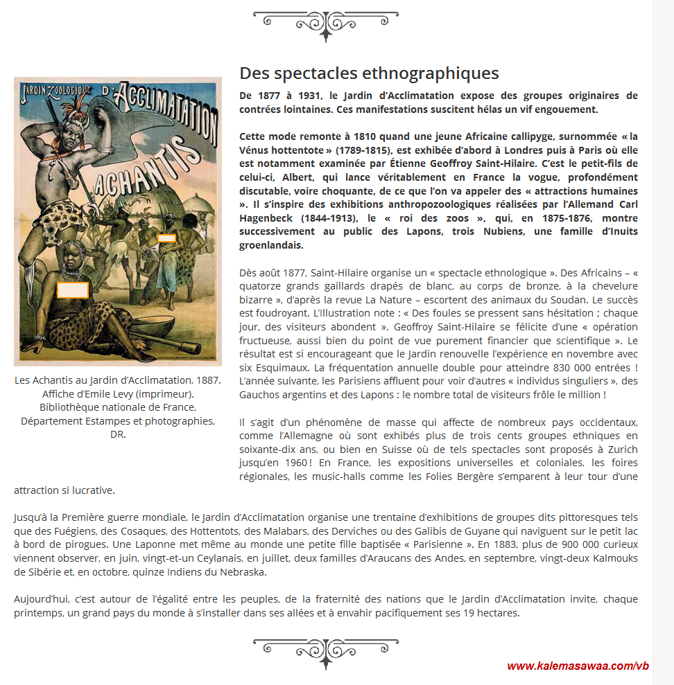 موقع حديقة الأقلمة(jardin d'acclimatation) يُفيد بأنّ بَشراً سود البشرة وحتى من الإسكيمو أستُغلّوا للترفيه عن علية القوم من ذوي البشرة البيضاء عن طريق إقامة عروض إثنوغرافية !!!؟؟؟؟