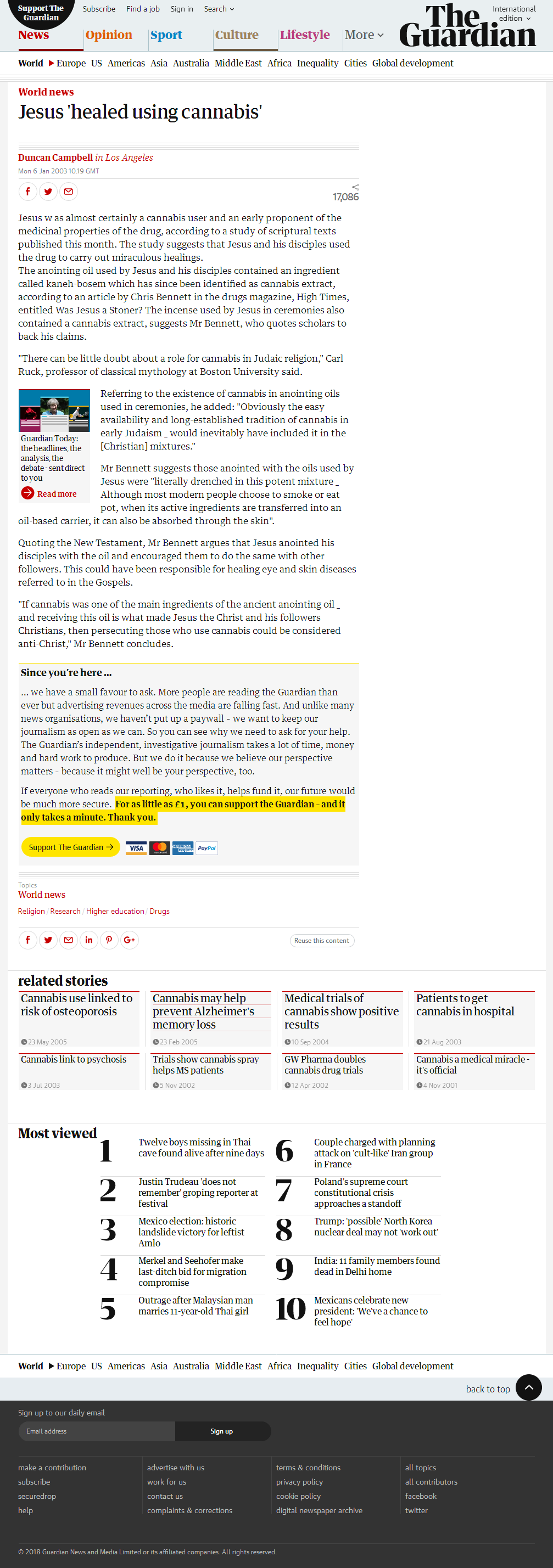 Jesus w as almost certainly a cannabis user and an early proponent of the medicinal properties of the drug, according to a study of scriptural texts published this month. The study suggests that jesus and his disciples used the drug to carry out miraculous healings. The anointing oil used by jesus and his disciples contained an ingredient calledkaneh-bosem which has since been identified as cannabis extract, according to an article by Chris Bennett in the drugs magazine, High Times, entitled Wasjesus a Stoner? The incense used by jesus in ceremonies also contained acannabis extract, suggests Mr Bennett, who quotes scholars to back his claims.
