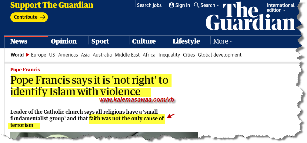 رغم كوننا لسنا بحاجة لكلام بابا الفاتيكان لتبرئة الإسلام من تهمة عاطلة باطلة إسمها الإرهاب ، إلاّ أننا نورد هناكلام الحبر الأعظم من باب إقامة الحجة على المخالف من فم الكهنة المتكلّمين بإرشاد و إلهام و توجيه من الرّوح القدُس !