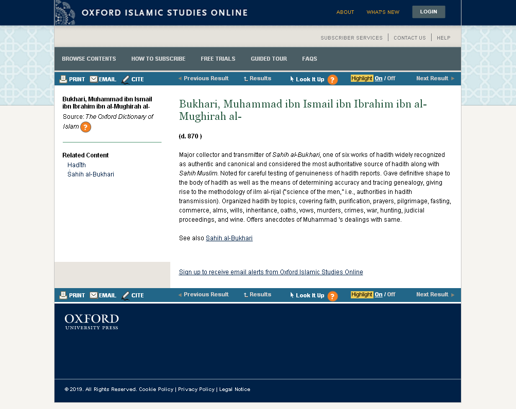 (d. 870 )Major collector and transmitter of Sahih al-Bukhari, one of six works of hadith widely recognized as authentic and canonical and considered the most authoritative source of hadith along with Sahih Muslim. Noted for careful testing of genuineness of hadith reports. Gave definitive shape to the body of hadith as well as the means of determining accuracy and tracing genealogy, giving rise to the methodology of ilm al-rijal (“science of the men,” i.e., authorities in hadith transmission). Organized hadith by topics, covering faith, purification, prayers, pilgrimage, fasting, commerce, alms, wills, inheritance, oaths, vows, murders, crimes, war, hunting, judicial proceedings, and wine. Offers anecdotes of Muhammad 's dealings with same.