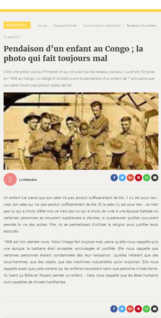 C’est une photo vue sur Pinterest et qui circulait sur les réseaux sociaux. La photo fût prise en 1908 au Congo. Un Belge lit la bible avant la pendaison d’un enfant de 7 ans parce que son père n’avait pas produit assez de blé.