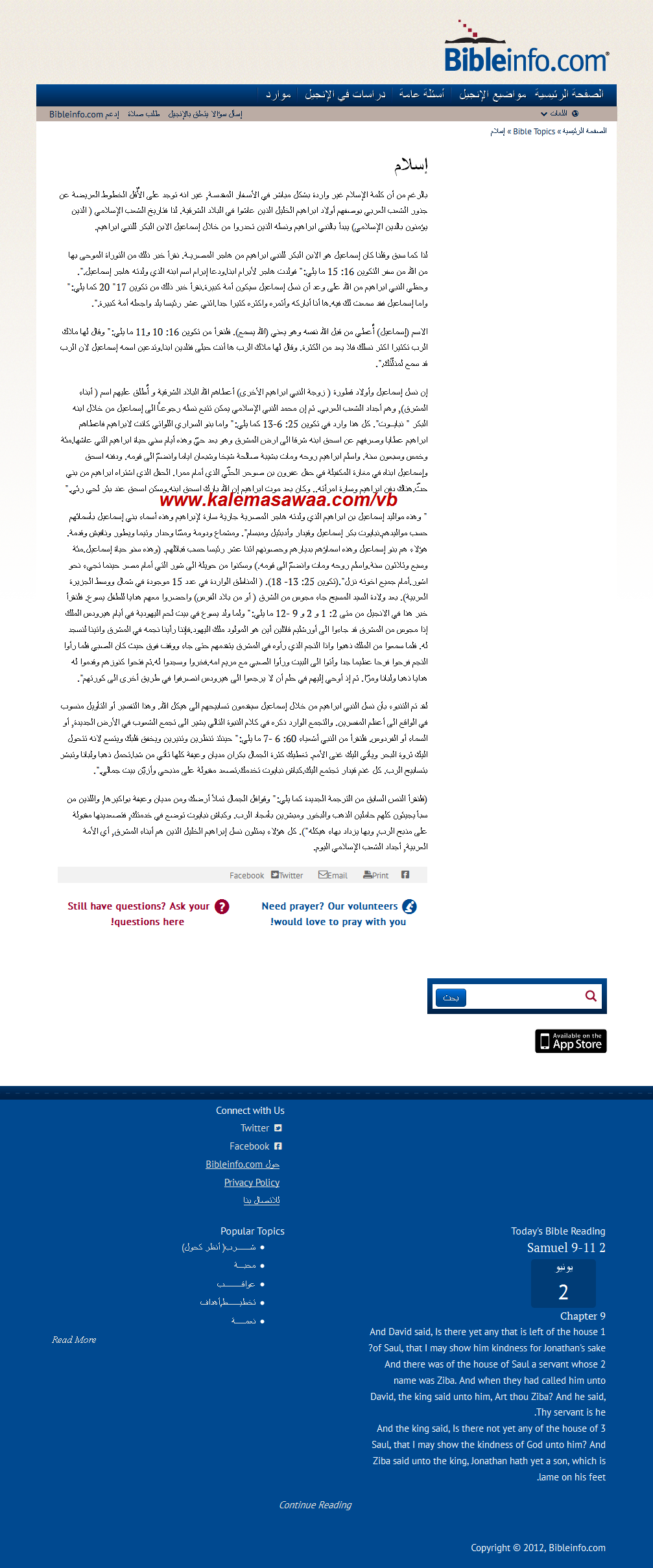 اقتباسبالرغم من أن كلمة الإسلام غير واردة بشكل مباشر في الأسـفار المقدسـة, غير انه توجد على الأٌقل الخطوط العريضة عن جذور الشعب العربي بوصفهم أولاد ابراهيم الخليل الذين عاشوا في البلاد الشرقية. لذا فتاريخ الشعب الإسلامي ( الذين يؤمنون بالدين الإسلامي) يبدأ بالنبي ابراهيم ونسله الذين تحدروا من خلال إسماعيل الابن البكر للنبي ابراهيم.