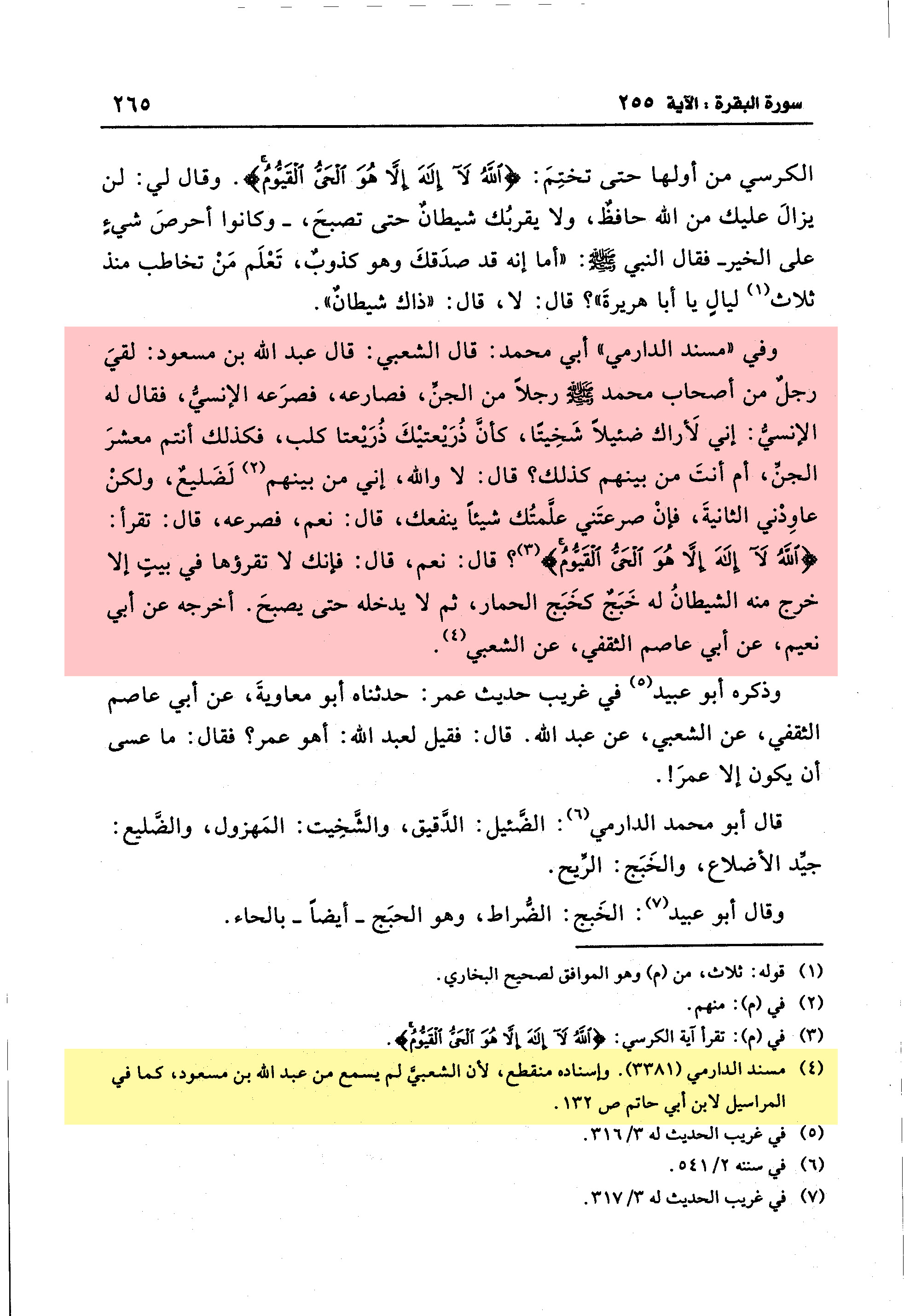وَفِي مُسْنَد الدَّارِمِيّ أَبِي مُحَمَّد قَالَ الشَّعْبِيّ قَالَ عَبْد اللَّه بْن مَسْعُود : لَقِيَ رَجُل مِنْ أَصْحَاب مُحَمَّد صَلَّى اللَّه عَلَيْهِ وَسَلَّمَ رَجُلًا مِنْ الْجِنّ فَصَارَعَهُ فَصَرَعَهُ الْإِنْسِيّ , فَقَالَ لَهُ الْإِنْسِيّ : إِنِّي لَأَرَاك ضَئِيلًا شَخِيتًا كَأَنَّ ذُرَيِّعَتَيْك ذَرَيِّعَتَا كَلْب فَكَذَلِكَ أَنْتُمْ مَعْشَر الْجِنّ , أَمْ أَنْتَ مِنْ بَيْنهمْ كَذَلِكَ ؟ قَالَ : لَا وَاَللَّه إِنِّي مِنْهُمْ لَضَلِيع وَلَكِنْ عَاوِدْنِي الثَّانِيَة فَإِنْ صَرَعْتنِي عَلَّمْتُك شَيْئًا يَنْفَعك , قَالَ نَعَمْ , فَصَرَعَهُ , قَالَ : تَقْرَأ آيَة الْكُرْسِيّ : " اللَّه لَا إِلَه إِلَّا هُوَ الْحَيّ الْقَيُّوم " ؟ قَالَ : نَعَمْ , قَالَ : فَإِنَّك لَا تَقْرَأهَا فِي بَيْت إِلَّا خَرَجَ مِنْهُ الشَّيْطَان لَهُ خَبَج كَخَبَج الْحِمَار ثُمَّ لَا يَدْخُلهُ حَتَّى يُصْبِح . أَخْرَجَهُ أَبُو نُعَيْم عَنْ أَبِي عَاصِم الثَّقَفِيّ عَنْ الشَّعْبِيّ . وَذَكَرَهُ أَبُو عُبَيْدَة فِي غَرِيب حَدِيث عُمَر حَدَّثَنَاهُ أَبُو مُعَاوِيَة عَنْ أَبِي عَاصِم الثَّقَفِيّ عَنْ الشَّعْبِيّ عَنْ عَبْد اللَّه قَالَ : فَقِيلَ لِعَبْدِ اللَّه : أَهُوَ عُمَر ؟ فَقَالَ : مَا عَسَى أَنْ يَكُون إِلَّا عُمَر . قَالَ أَبُو مُحَمَّد الدَّارِمِيّ : الضَّئِيل : الدَّقِيق , وَالشَّخِيت : الْمَهْزُول , وَالضَّلِيع : جَيِّد الْأَضْلَاع , وَالْخَبَج : الرِّيح . وَقَالَ أَبُو عُبَيْدَة : الْخَبَج : الضُّرَاط , وَهُوَ الْحَبَج أَيْضًا بِالْحَاءِ .