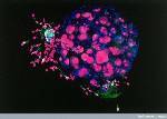 يبدو ان الوضع في حالة حرب ، ولكنه في الواقع البويضة بعد خمسة أيام من الإخصاب، مع بعض الخلايا المنوية المتبقية لا تزال شائكة حولها. نرىالجنين ونوى الخلايا المنوية باللون الأرجواني بينما ذيول الحيوانات المنوية هي الخضراء. المناطق الزرقاء هي تقاطعات الفجوة ، والتي تشكل الاتصالات بين الخلايا.