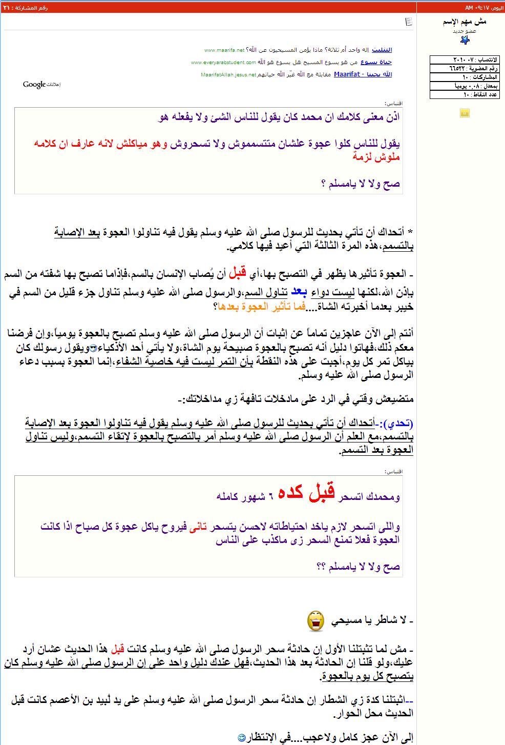 - مش لما تثبتلنا الأول إن حادثة سحر الرسول صلى الله عليه وسلم كانت قبل هذا الحديث عشان أرد عليك,ولو قلنا إن الحادثة بعد هذا الحديث,فهل عندك دليل واحد على إن الرسول صلى الله عليه وسلم كان يتصبح كل يوم بالعجوة.