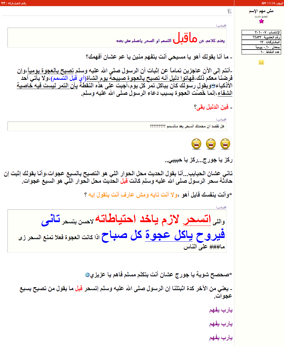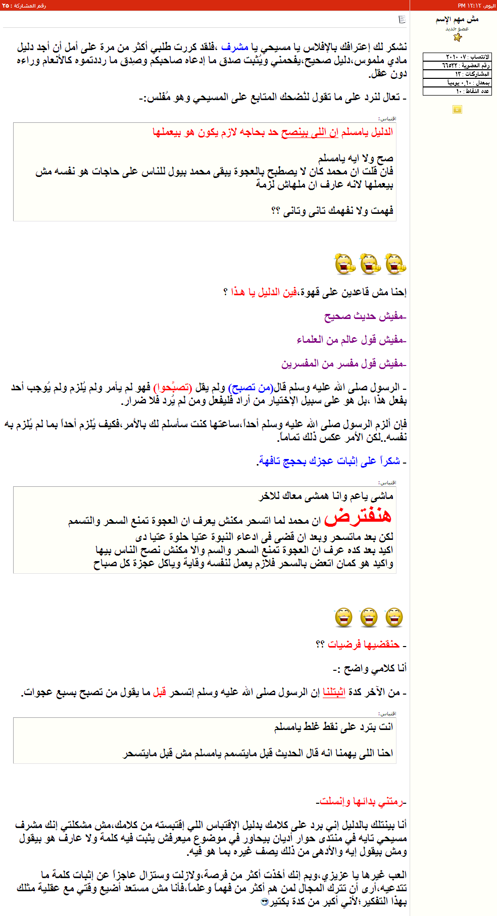 ملحظ:- أنا لا أعمم الكلام على كل المسيحيين بالطبع,فهناك المحترمين,الذين نُكّن لهم كل إحترام,ونسأل الله أن يهدينا وإياهم لما فيه الخير,ولكن كلامي موجّه للفئة الباغية منهم,التي لا تفتأ أن تطعن في الإسلام بشتى الطرق.