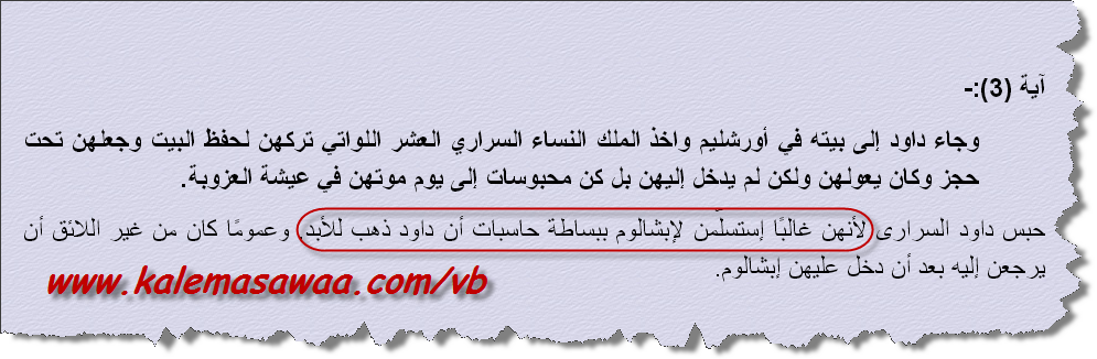 داود التوراتي عاقب نساءه العشر ليس بسبب التعدد و إنما لأنهن سقطن بين براثن الخطية بإرتمائهن في أحضان أبشالوم !