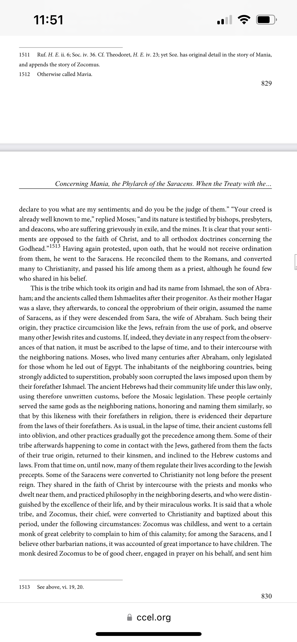 نقرا من كتاب تاريخ الكنيسة لمؤرخ الكنيسة الرومانية الشرقية سوزمينوس الكتاب السادس الصفحة 830