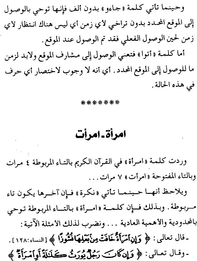مثل آخر :آية 12 من سورة النساء ""...وَإِن كَانَ رَجُلٌ يُورَثُ كَلاَلَةً أَو امْرَأَةٌ وَلَهُ أَخٌ أَوْ أُخْتٌ فَلِكُلِّ وَاحِدٍ مِّنْهُمَا السُّدُسُ فَإِن كَانُوَاْ أَكْثَرَ مِن ذَلِكَ فَهُمْ شُرَكَاء فِي الثُّلُثِ ...""