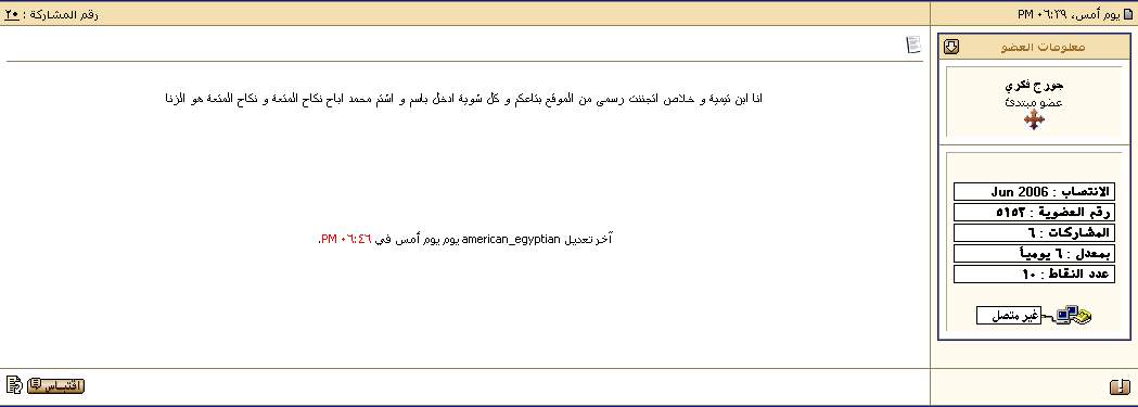 سيدي انا مشترك في هذا الموضوع في هذا الرابط الذي وضعته تحت اسم (أبو حطب) . ولا توجد أي موافقة على مناظرة الشيخ على الهواء مباشرة لا من أميركان الجبان الذي يريدها تحت بير السلم ولا من القمص الذي يتهرب من الشيخ ويرتعب من مجرد سماع اسمه .اقتباسوالرابط وجود لدى بالحقيقة الكاملة التى يريد المسلمين اغفالعها عنك