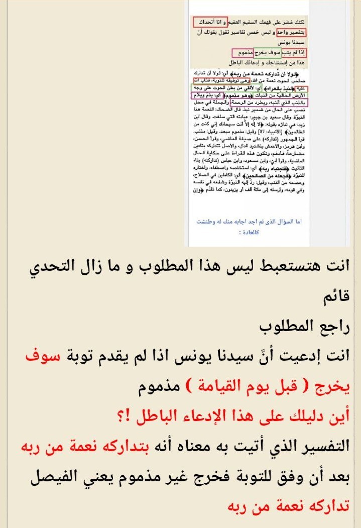 و ما زال التحدي قائم و مستمر لك أو أي مسيحي أن تأتي بتفسير يقول " أن سيدنا يونس إذا لم يقدم توبه سوف يخرج مذموم قبل يوم القيامة " و بالرغم من أن التفاسير ليست حجة علينا إذا خالفت صريح القرآن أو صحيح السنة