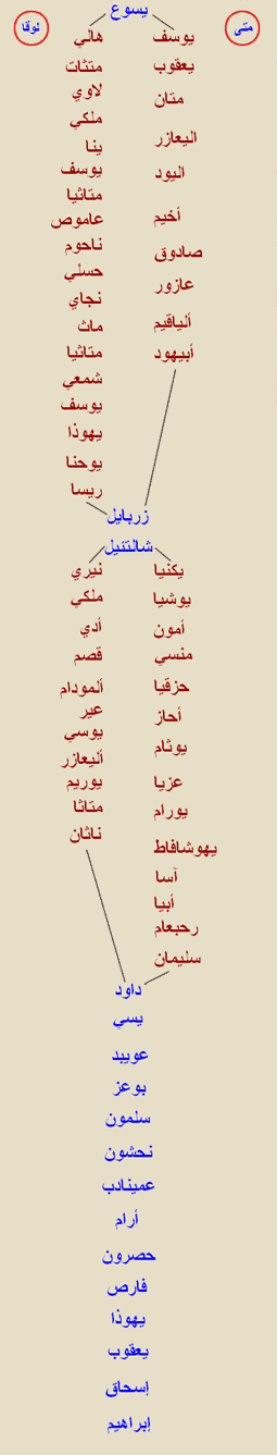 المسيح ابن 1 - يوسف 2- يعقوب 3 - متان 4 - اليعازر 5 - اليود 6 - أخيم 7 - صادوق 8 - عازور 9 - الياقيم 10 - ابيهود 11 - زربابل 12 - شألتيل 13 - بكنيا 14 - يوشا 15 - امون 16 - منسى 17 - حزقيا 18- أحاز 19 - يوئام 20- عزيا 21 - يورام 22 - يهو شافاط 23 - أسا 24 - أبيا 25 - رحبعام 26 سليمان 27 - داود.