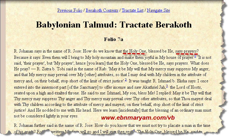 . يوهانان يقول باسم ر. خوسيه: كيف نعرف أن القدوس ، المبارك ، يقول الصلوات؟ لأنه يقول: حتى أنا سوف أحضر إلى جبل قدسي وجعلهم فرحين في بيتي الصلاة. لا يقال ، 'صلاتهم' ، ولكن 'صلاتي' ؛ من هنا ، تعلم أن القدوس ، المبارك ، يقول الصلوات