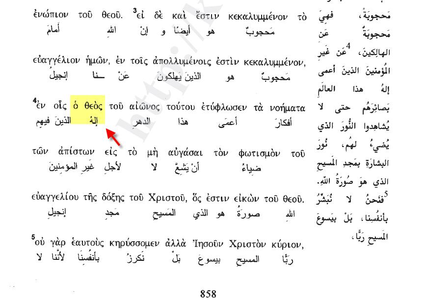 ἐν οἷς ὁ θεὸς τοῦ αἰῶνος τούτου ἐτύφλωσεν τὰ νοήματα τῶν ἀπίστων εἰς τὸ μὴ αὐγάσαι τὸν φωτισμὸν τοῦ εὐαγγελίου τῆς δόξης τοῦ Χριστοῦ, ὅς ἐστιν εἰκὼν τοῦ θεοῦ.