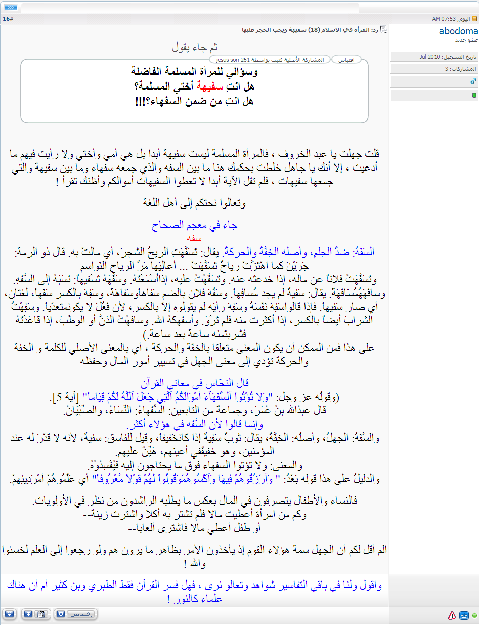 قل جهلت يا عبد الخروف ، فالمرأة المسلمة ليست سفيهة أبدا بل هي أمي وأختي ولا رأيت فيهم ما أدعيت ، إلا أنك يا جاهل خلطت بحكمك هنا ما بين السفه والذي جمعه سفهاء وما بين سفيهة والتي جمعها سفيهات ، فلم تقل الآية أبدا لا تعطوا السفيهات أموالكم وأظنك تقرأ !