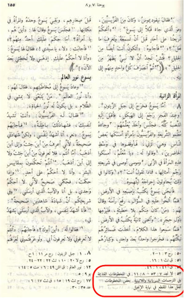 3- الترجمة العربية المشتركة - انجيل يوحنا:8 قصة المرأة الزانية - (لاااا نــجد 35:7 -- 11:8 في المخطوطات و في الترجمات السريانية و اللاتينية, و بعض المخطوطات تجعل هذا المقطع في نهاية الانجيل).