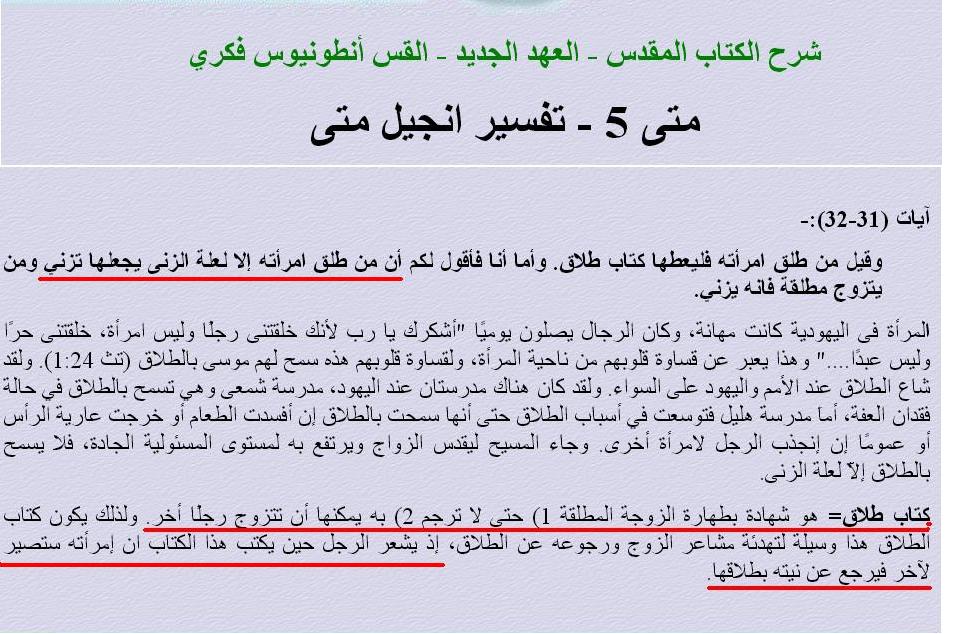 النصوص وتفسيرها أقرت بوجود الطلاق لعلة غير علة الزنى وطبعا النصارى يعتقدون بعدم نسخ النصوص