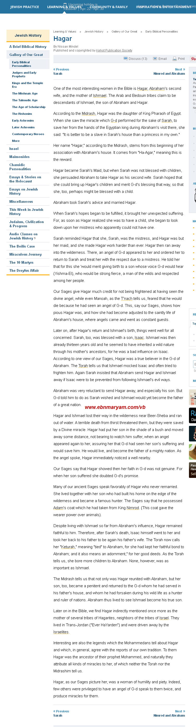 Hagar and Ishmael lost their way in the wilderness near Beer-Sheba and ran out of water. A terrible death from thirst threatened them, but they were saved by a Divine miracle. Hagar had put her son in the shade of a bush and moved away some distance, not bearing to watch him suffer, when an angel appeared again to her, assuring her that G‑d had seen her son's suffering and would save him. He would live, and become the father of a mighty nation. As the angel spoke, Hagar immediately noticed a well nearby.Our Sages say that Hagar showed then her faith in G‑d was not genuine. For when her son suffered she doubted G‑d's promise.Many of our ancient Sages speak favorably of Hagar who never remarried. She lived together with her son who had built his home on the edge of the wilderness and became a famous hunter. The Sages say that he possessed Adam's coat which he had taken from King Nimrod. (This coat gave the wearer power over animals).