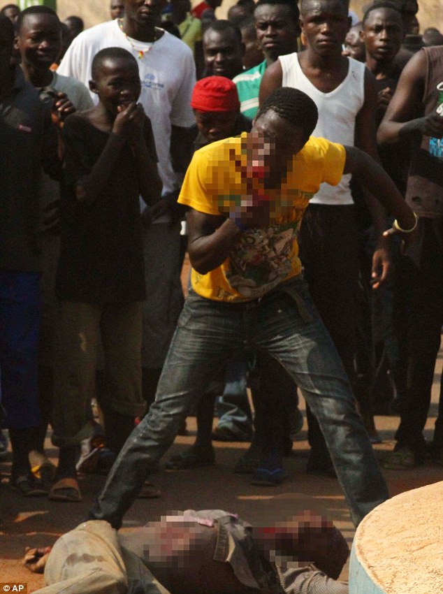 بعد حرق جسد مواطنه المسلم و التمثيل بجثته ، قام أحد أفراد العصابات الإرهابية المسيحية في مشهد بربري وحشي بأكل أجزاء من جسد المغدور !!