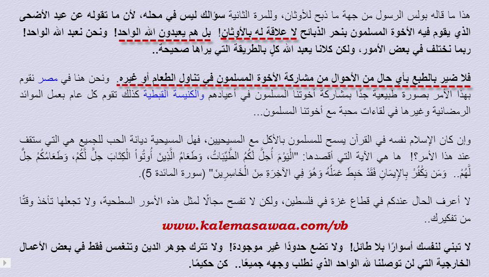 وإن كان الإسلام نفسه في القرآن يسمح للمسلمون بالأكل مع المسيحيين، فهل المسيحية ديانة الحب للجميع هي التي ستقف عند هذا الأمر؟! ها هي الآية التي أقصدها: "الْيَوْمَ أُحِلَّ لَكُمُ الطَّيِّبَاتُ، وَطَعَامُ الَّذِينَ أُوتُواْ الْكِتَابَ حِلٌّ لَّكُمْ، وَطَعَامُكُمْ حِلُّ لَّهُمْ.. وَمَن يَكْفُرْ بِالإِيمَانِ فَقَدْ حَبِطَ عَمَلُهُ وَهُوَ فِي الآخِرَةِ مِنَ الْخَاسِرِينَ" (سورة المائدة 5).