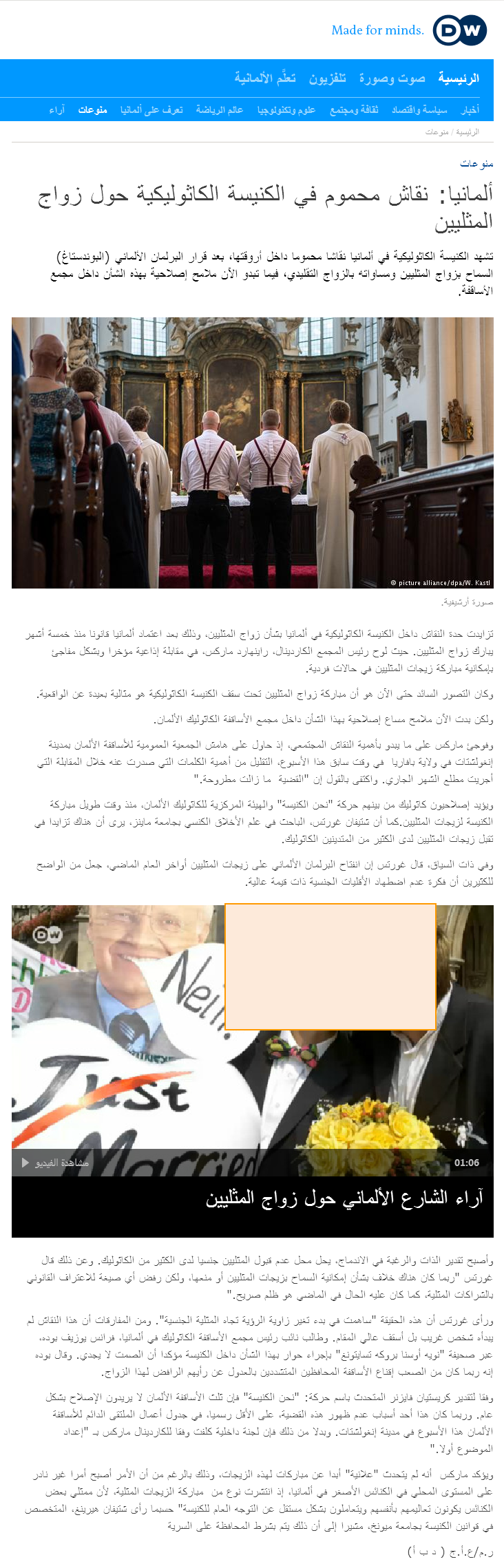 تزايدت حدة النقاش داخل الكنيسة الكاثوليكية في ألمانيا بشأن زواج المثليين، وذلك بعد اعتماد ألمانيا قانونا منذ خمسة أشهر يبارك زواج المثليين. حيث لوح رئيس المجمع الكاردينال، راينهارد ماركس، في مقابلة إذاعية مؤخرا وبشكل مفاجئ بإمكانية مباركة زيجات المثليين في حالات فردية.