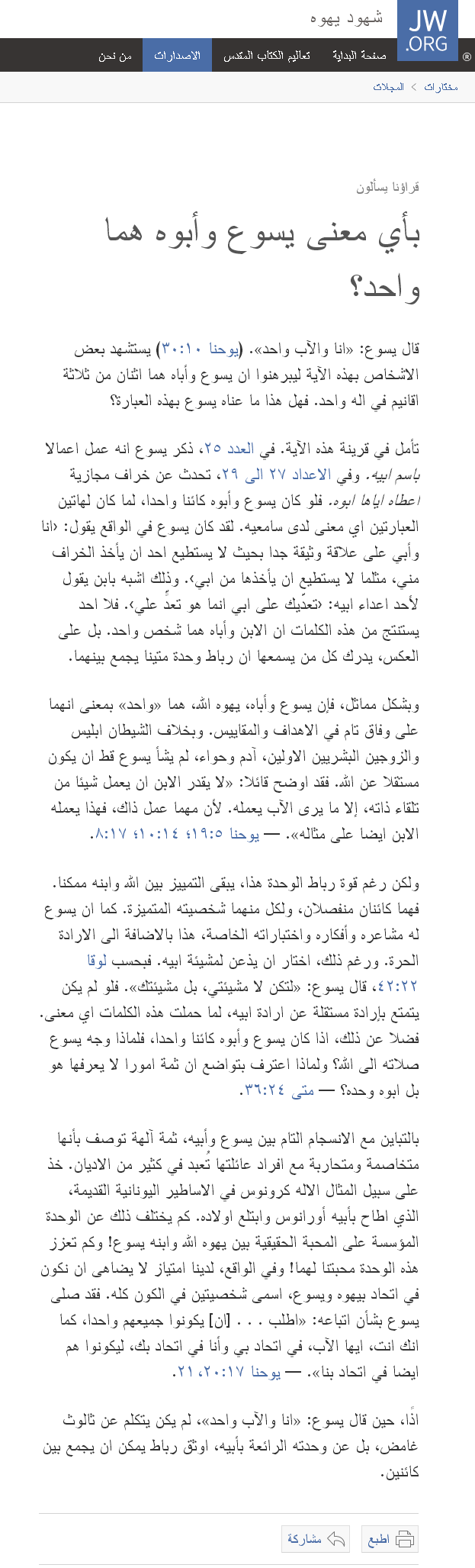تأمل في قرينة هذه الآية. في العدد ٢٥، ذكر يسوع انه عمل اعمالا باسم ابيه. وفي الاعداد ٢٧ الى ٢٩، تحدث عن خراف مجازية اعطاه اياها ابوه. فلو كان يسوع وأبوه كائنا واحدا، لما كان لهاتين العبارتين اي معنى لدى سامعيه. لقد كان يسوع في الواقع يقول: ‹انا وأبي على علاقة وثيقة جدا بحيث لا يستطيع احد ان يأخذ الخراف مني، مثلما لا يستطيع ان يأخذها من ابي›. وذلك اشبه بابن يقول لأحد اعداء ابيه: ‹تعدّيك على ابي انما هو تعدٍّ علي›. فلا احد يستنتج من هذه الكلمات ان الابن وأباه هما شخص واحد. بل على العكس، يدرك كل من يسمعها ان رباط وحدة متينا يجمع بينهما.