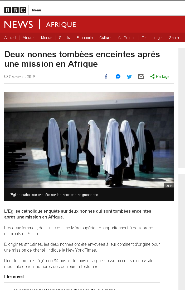 أفاد موقع بي بي سي في نسخته الفرنسية بإكتشاف حمل راهبتين كانتا في مهمة توزيع مساعدات بافريقيا .