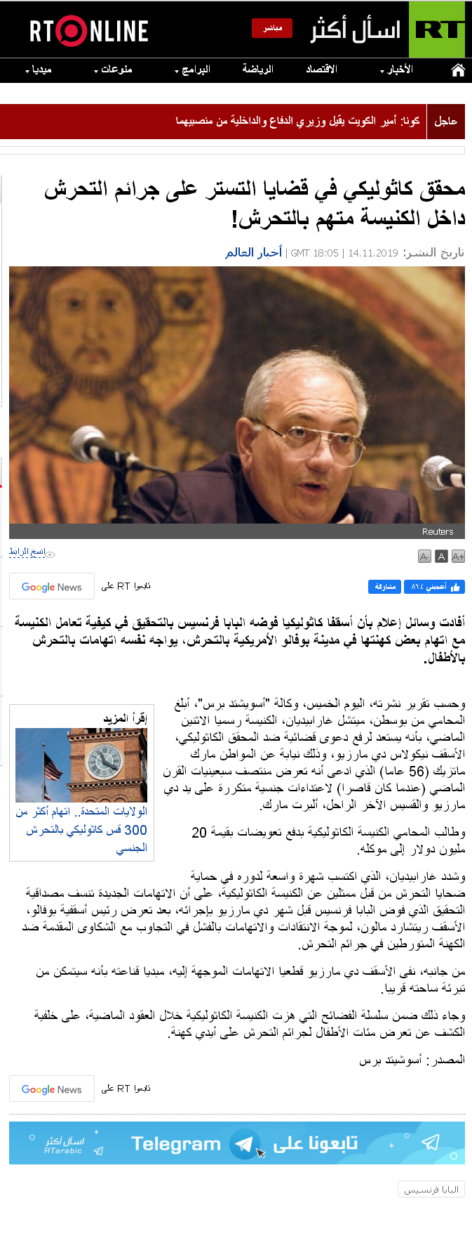 وطالب المحامي الكنيسة الكاثوليكية بدفع تعويضات بقيمة 20 مليون دولار إلى موكله.