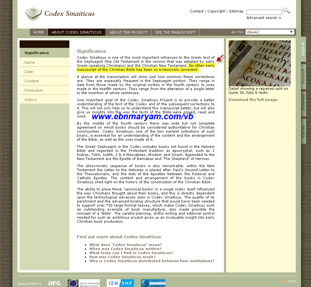 اقتباساقتباسالقائمون على موقع المخطوطة السينائية المسوقون بالروح القُدُس يعترفون بأنّ هذه الأخيرة تمّ (فضّ بكارتها) و (إغتصابها) المرّة تلو المرّة !
