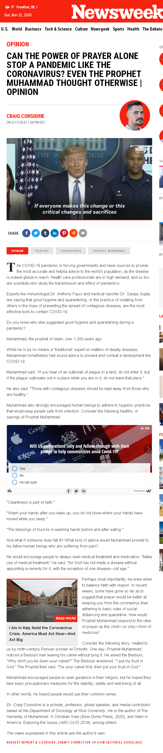 التقرير جاء بعنوان: "هل يمكن لقوة الصلاة وحدها وقف جائحة؟ حتى النبي محمد كان له رأي آخر"، حيث قال الطبيب كريغ كونسيدين، كاتب التقرير المنشور في الـ17 من مارس/ اذار الجاري: "خبراء المناعة مثل الطبيب انتوني فوتشي والمراسلون الطبيون مثل سانجي غوبتا يقولون إن نظافة شخصية جيدة وحجر صحي هي أفضل الوسائل لتطويق كوفيد-19"