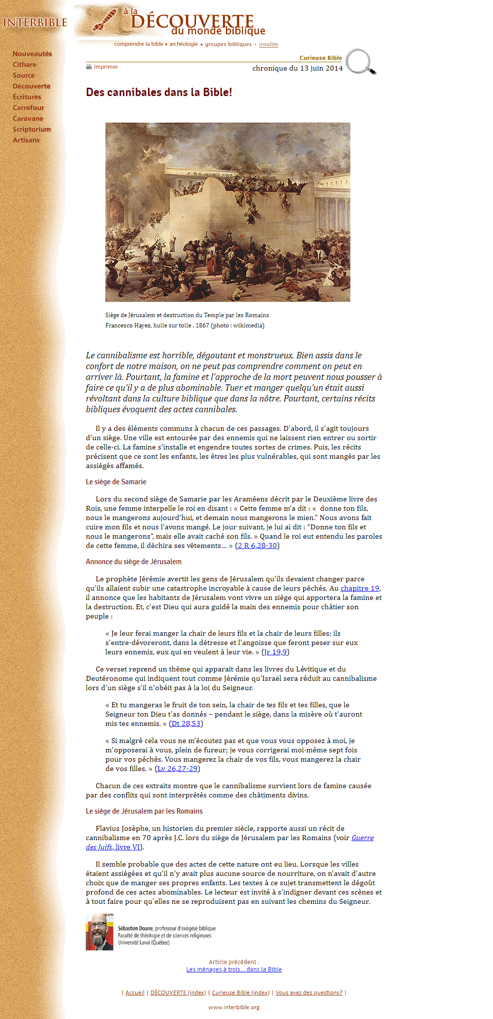Le cannibalisme est horrible, dégoutant et monstrueux. Bien assis dans le confort de notre maison, on ne peut pas comprendre comment on peut en arriver là. Pourtant, la famine et l’approche de la mort peuvent nous pousser à faire ce qu’il y a de plus abominable. Tuer et manger quelqu’un était aussi révoltant dans la culture biblique que dans la nôtre. Pourtant, certains récits bibliques évoquent des actes cannibales.