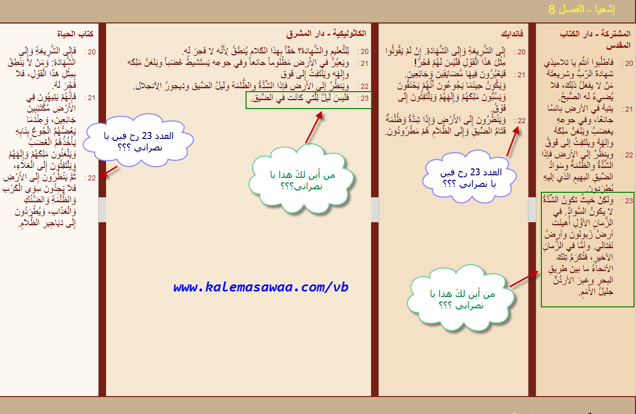 ترجمات عربية أثبتت نصّ إشعياء 8 : 23 ( مشتركة + كاثوليكية ) في حين أخرى حذفته ( حياة + فاندايك ) !