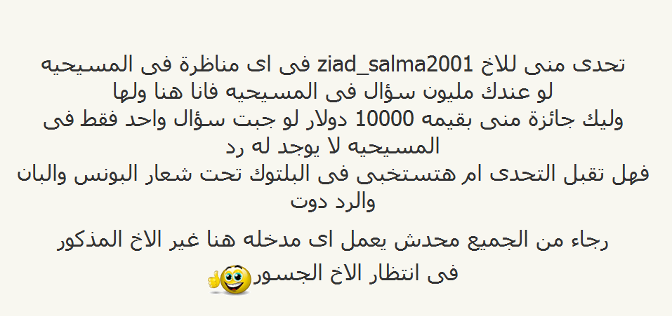 وقال بالنص "تحدى منى للاخ ziad_salma2001 فى اى مناظرة فى المسيحيه لو عندك مليون سؤال فى المسيحيه فانا هنا ولها وليك جائزة منى بقيمه