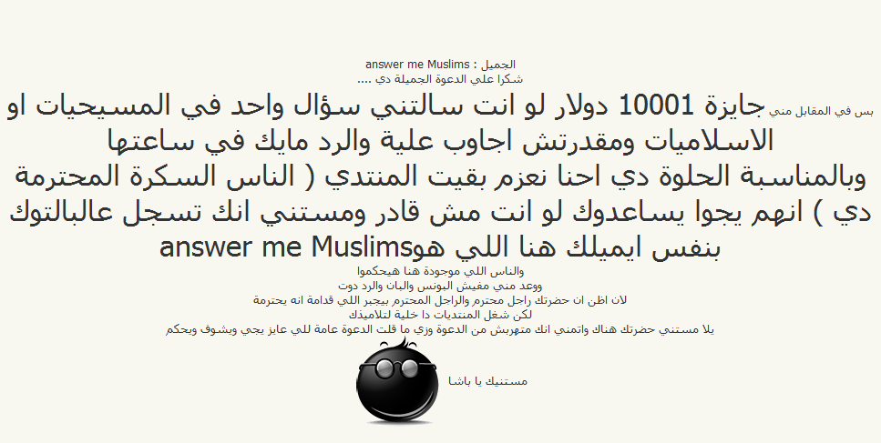 بس في المقابل مني جايزة 10001 دولار لو انت سالتني سؤال واحد في المسيحيات او الاسلاميات ومقدرتش اجاوب علية والرد مايك في ساعتها وبالمناسبة الحلوة دي احنا نعزم بقيت المنتدي ( الناس السكرة المحترمة دي ) انهم يجوا يساعدوك لو انت مش قادر ومستني انك تسجل عالبالتوك بنفس ايميلك هنا اللي هوanswer me Muslims والناس اللي موجودة هنا هيحكموا