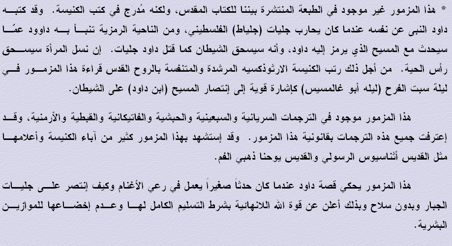 الشائع أن سفر المزامير مكون من 150 مزمور..ولكن هذه إجابة خاطئة ... فمن يعرف الإجابة الصحيحة ؟؟ وما هو عدد المزامير الحقيقى والذى يتكتم عليه النصارى ؟؟؟